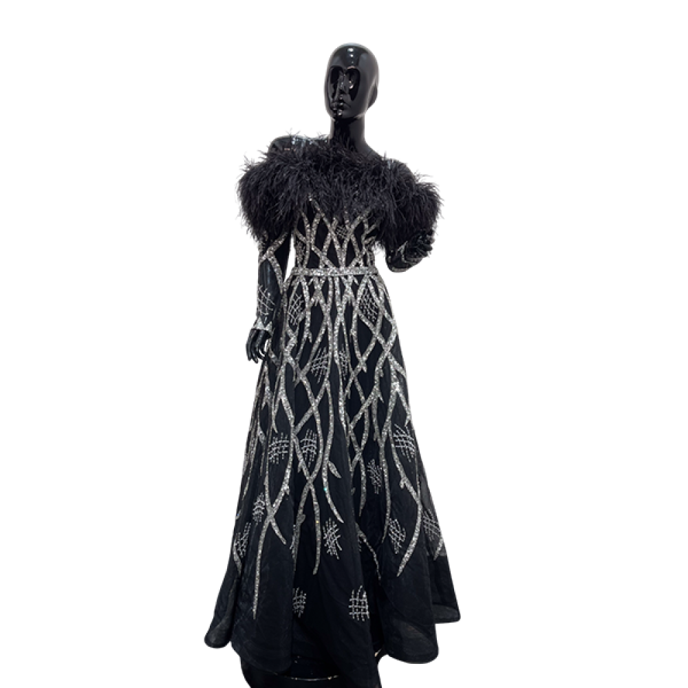• الأكمام: بدون أكمام – أوف شولدر مع لمسة ريش