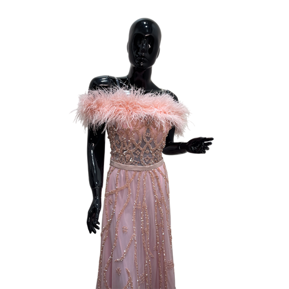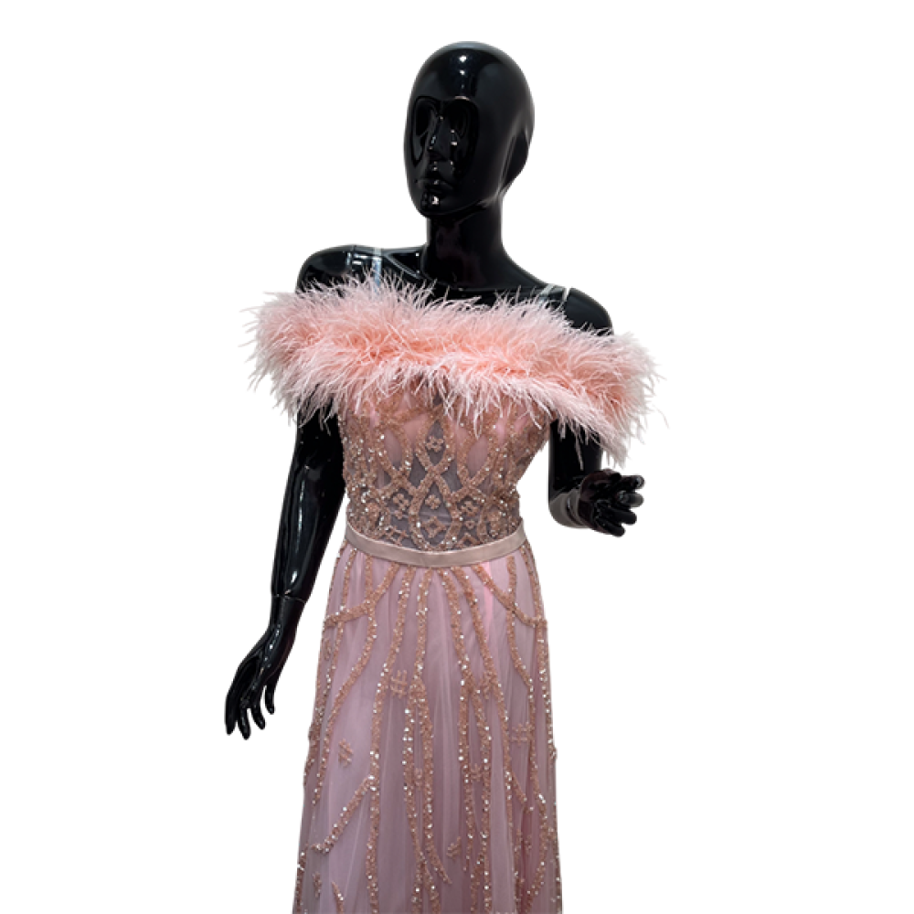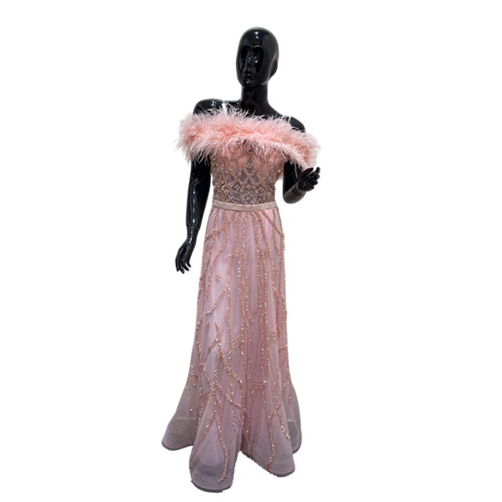 أبرزي أنوثتك بأرقى إطلالة مع فستان وردي سواريه مصمم ليجمع بين الفخامة والنعومة في آنٍ واحد. تم تنفيذ التصميم بعناية ليناسب ذوق المرأة السعودية التي تبحث عن الأناقة في كل مناسبة. الفستان يأتي بقصة أوف شولدر جذابة وتفاصيل من الريش الناعم تعكس الفخامة والرقي، مع تطريز دقيق يزين الصدر والتنورة ليمنحك بريقًا لا يُقاوم.