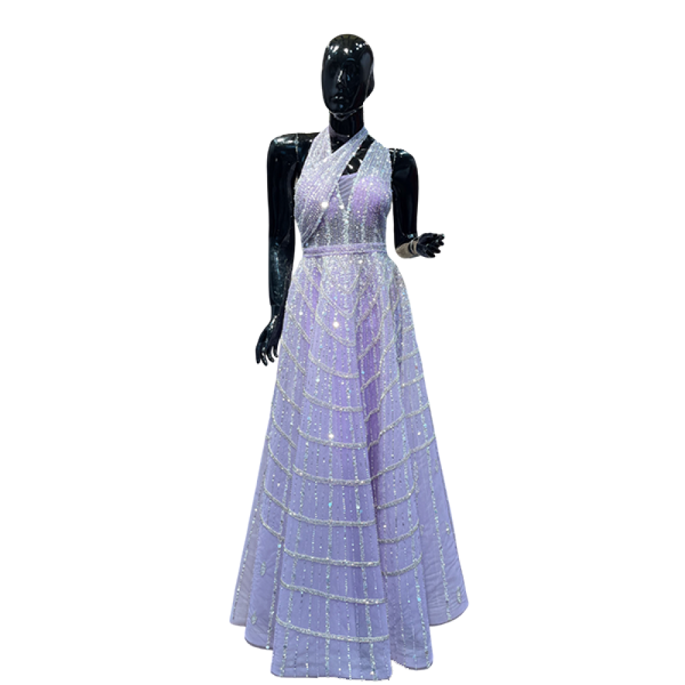 تميّزي بإطلالة فريدة تلفت الأنظار في كل مناسبة مع فستان موف فاتح بتصميم متقاطع عند الرقبة، يعكس ذوقك الراقي وأناقتك العصرية. الفستان طويل، واسع، ومزخرف بخطوط لامعة تضيف لمسة ساحرة تتلألأ تحت الإضاءة. اللون الموف الفاتح يعكس نعومة وأنوثة لا مثيل لها، ويجعله خياراً مثالياً للسهرات، الخطوبة، أو المناسبات الراقية.